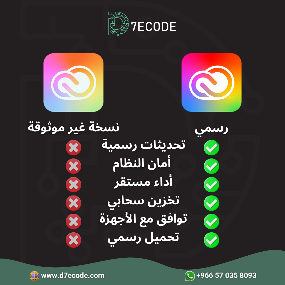شركة Adobe لا توفر أي نوع من الاشتراكات مدى الحياة، وجميع التراخيص الرسمية تكون شهرية أو سنوية فقط. أي عرض آخر بمدى الحياة يعتبر غير أصلي.