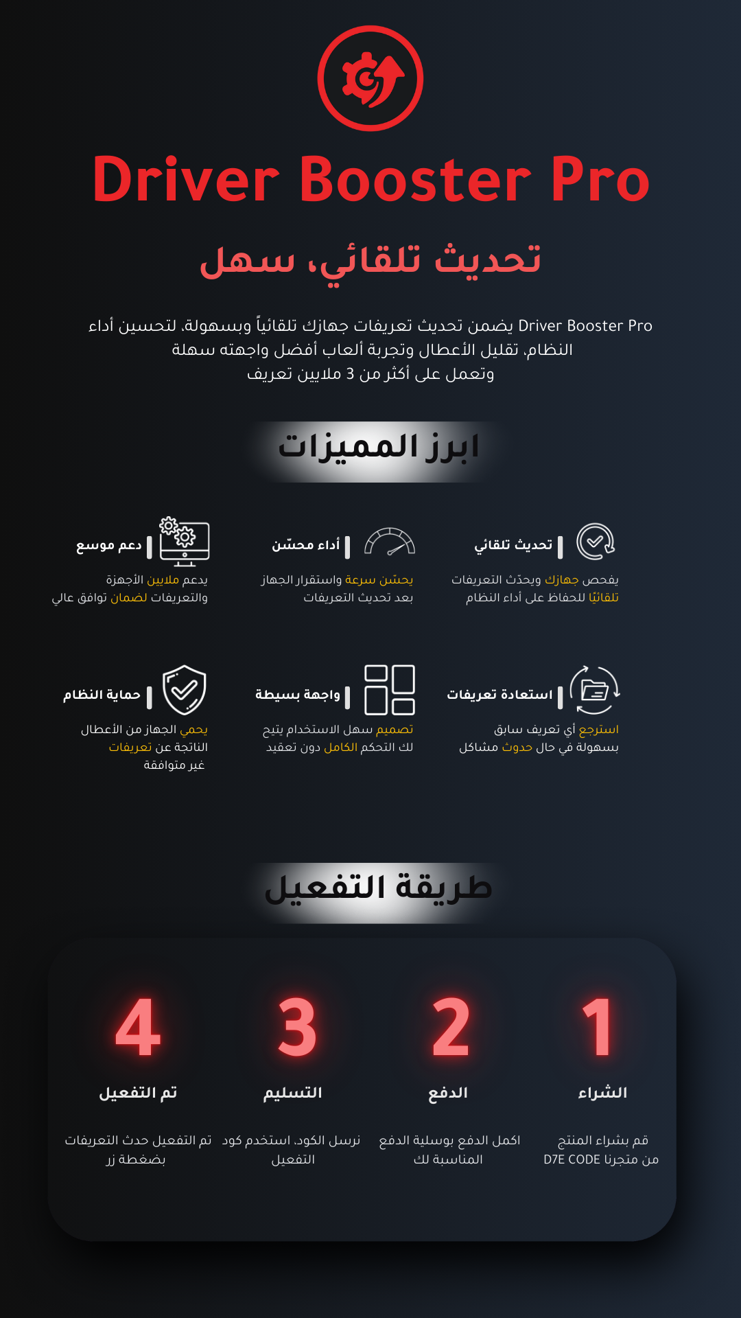 🚀 حافظ على أداء جهازك بأقصى سرعة! لا داعي للبحث اليدوي عن تعريفات جهازك بعد الآن، حيث يقوم Driver Booster Pro بالكشف تلقائيًا عن التعريفات القديمة أو المفقودة وتحميل أحدث الإصدارات مباشرة من الإنترنت وتثبيتها على جهازك، مما يضمن لك أداءً سلسًا وسريعًا
